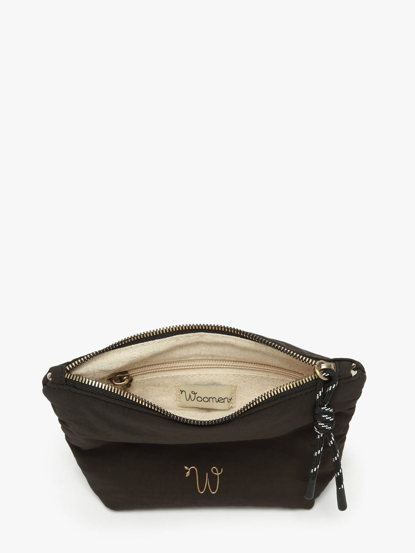 La petite trousse WOOMEN de la ligne PRIMEVERE, réalisée en nylon recyclé, se distingue par son logo en résine dorée W et son cordon fantaisie. Dotée d’une fermeture zippée sécurisée, elle offre un intérieur doublé en coton et lin avec une poche, alliant praticité et élégance dans un format compact, parfait pour ranger l’essentiel avec style et respect de l’environnement.