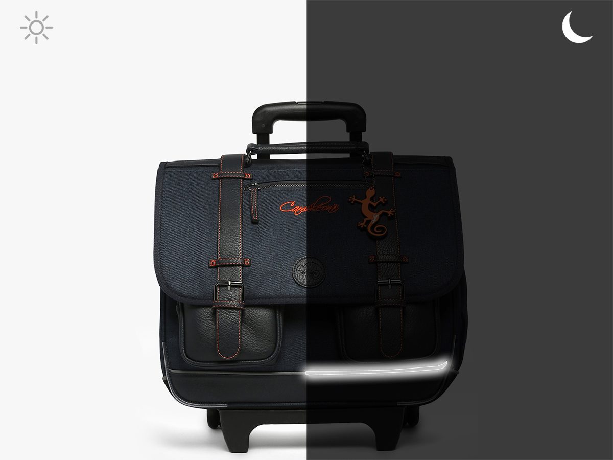 41 cm - 31 litres - 2.6 kg ~ Ce cartable à roulettes 3 compartiments 41cm de la ligne Vintage Urban de chez Caméléon est idéal pour le CM1 et le CM2. On aime ce cartable pour son grand espace, il se compose de trois compartiments permettant d’y glisser des cahiers ainsi que des classeurs allant jusqu’à 32x29x7cm. Il possède également une poche intérieure zippée. À l’extérieur, il se compose de deux poches à fermeture éclair sur le devant ainsi que d’un porte gourde latéral. Une bande réfléchissante est présente sur l’avant afin de garantir la sécurité de votre enfant. Son fond ainsi que ses côtés sont renforcés, permettant une utilisation quotidienne. Il est aussi possible de l'utiliser en sac à dos grâce aux bretelles déclipsables qui se trouvent dans la poche arrière du sac et à la protection rembourrée au niveau de l'armature des roues pour protéger le dos de votre enfant. Afin de garantir un confort optimal, les bretelles et le dos de ce cartable sont rembourrés. Petit plus, il dispose d’une étiquette nom, d’une règle offerte et de son porte-clé caméléon sur la poignée !
